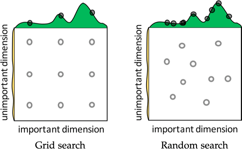 Random Search 的使用方法 Grid Search 基本一致,区别在于 Random Search 会在超参数的组合空间内随机采样搜索,其搜索能力取决于设定的抽样次数,最重要的是收敛更快 1。