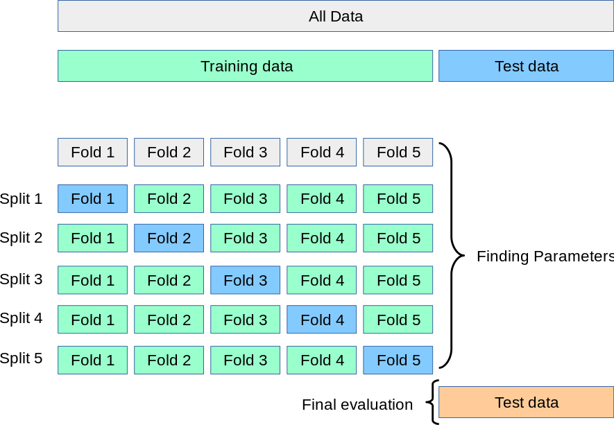 交叉验证法(cross validation)先将数据集 \(D\) 划分为 \(k\) 个大小相似的互斥子集,即 \(D = D_1 \cup D_2 \cup ... \cup D_k\),\(D_i \cap D_j = \varnothing (i \neq j)\)。每个子集 \(D_i\) 都尽可能保持数据分布的一致性,即从 \(D\) 中通过分层采样得到。然后,每次用 \(k − 1\) 个子集的并集作为训练集,余下的那个子集作为测试集;这样就可获得 \(k\) 组训练/测试集,从而可进行 \(k\) 次训练和测试,最终返回的是这 \(k\) 个测试结果的均值。